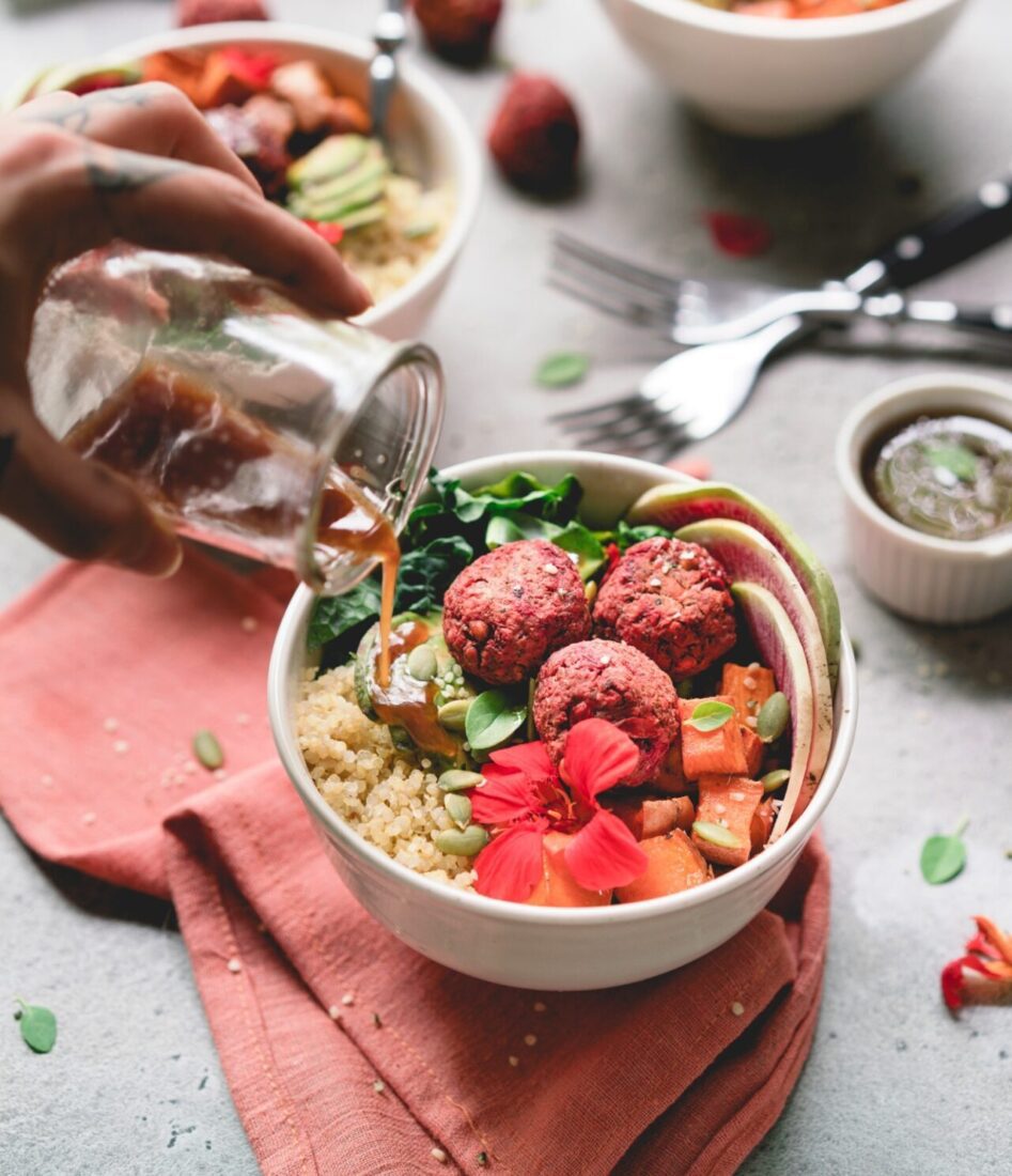 Nos boules à la betterave VG Gourmet n'ajouteront pas seulement une belle touche de couleur, mais donneront aussi à ce bol un puissant apport de protéines!