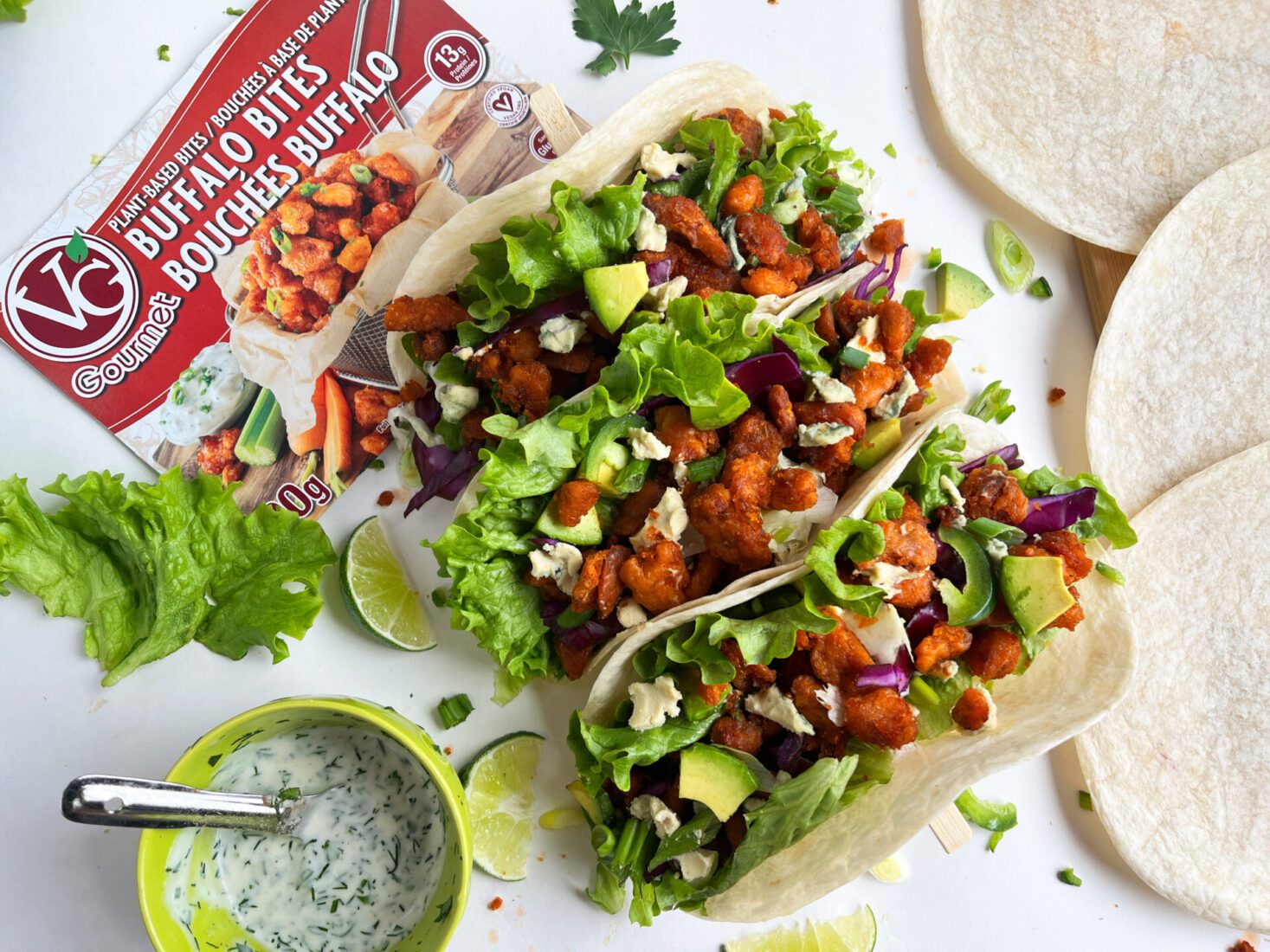Commence par une tortilla et recouvre-la de laitue, de chou rouge et ajoute nos bouchées Buffalo VG Gourmet, Nuts for Cheese "Super Blue", des tranches d'avocat, de l'oignon vert et du jalapeño (si désiré)